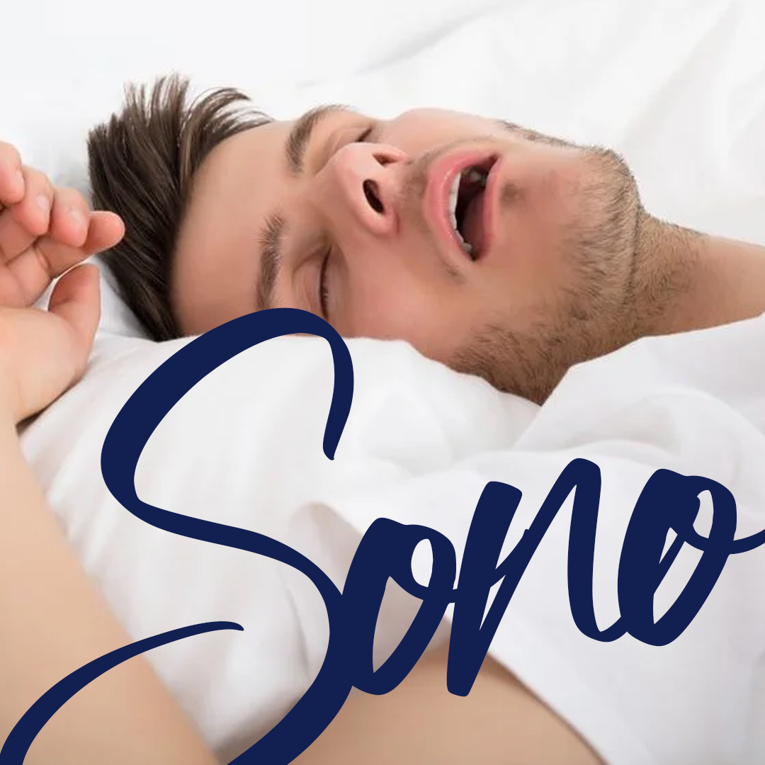 Homem dormindo numa cama com a legenda "sono" em primeiro plano.